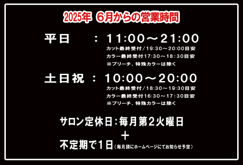 【土曜日・日曜日・祝日】10:00~20:00 カット最終受付 / 18:30 ~ 19:30 目安 カラー最終受付 / 16:30 ~ 17:30 目安 |